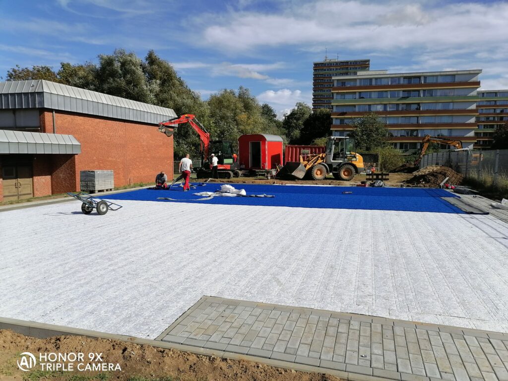 Wo vorher ein Feld mit mehr Unkraut als Rasen war, erstrahlt jetzt unser Fußballkleinfeld mit Kunstrasen. Früher dominierte hier ein schmutziges Braun, jetzt findet man ein tolles Spielfeld – immer noch nicht grün, aber ein tolles Blau. Beste Voraussetzungen, um das Projekt „Fußball-Stadtmeister“ in Angriff zu nehmen.